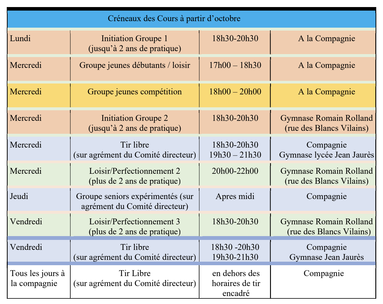 Pour certains créneaux hors initiation, 2 horaires sont indiqués car en fonction de la saison, l’entraînement aura lieu soit en gymnase (l’hiver), soit à la Compagnie (au printemps).